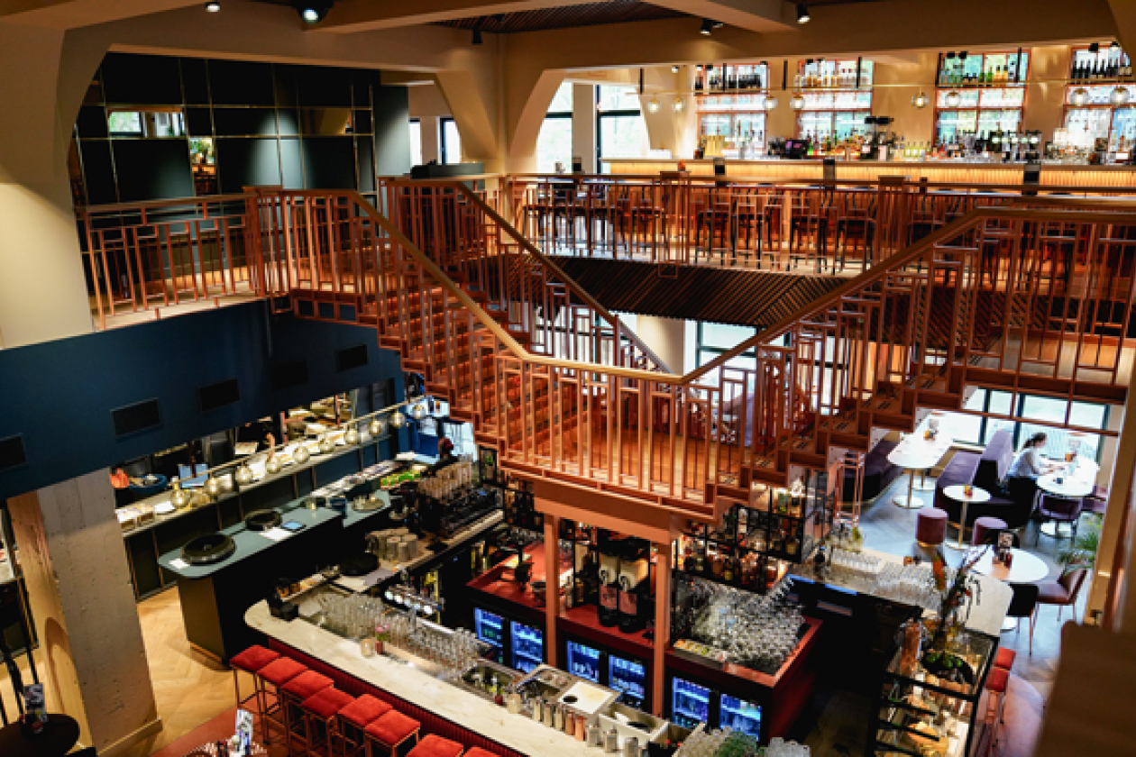 Hoe hoger de verdieping, hoe magischer de ervaring. Het lichtkunstwerk van ‘Children of the Light’ zorgt voor een totaal vervreemdende entree van de parel van Capital C, de signature eventspace The High Light. Lisa vertelt dat ze bezoekers hier expres even laten zoeken: ‘De lichte verwarring zorgt ervoor dat er echt even op de resetknop wordt gedrukt. ‘Kom maar op met dat nieuwe’, lijkt daarna steevast de tendens bij de gasten.’ We lopen letterlijk het licht tegemoet, de gigantische glazen dakkoepel in. De spectaculaire evenementenruimte bestaat uit twee verdiepingen die met flexibele glazen wanden ook nog in meerdere ruimtes te verdelen zijn. Het is niet moeilijk om je voor te stellen hoe de lichtjes van de stad ’s avonds voor een wow-effect zorgen. Duurzaamheid met een creatieve twist vind je in de details: het dak van de koepel bevat honderden kleine zonnepanelen en de 3D-geprinte terrazzovloer bestaat uit Bud-bierflesjes. ‘De eerste evenementen in deze spectaculaire ruimte geschikt voor 400 personen waren een groot succes’, vertelt Lisa trots. ‘Zo waren we bijvoorbeeld een van de venues tijdens de Amsterdam Fashion Week, maar je ziet hier ook zo een productpresentatie, een congres, een groot feest of een luxe diner onder de sterren voor je.’