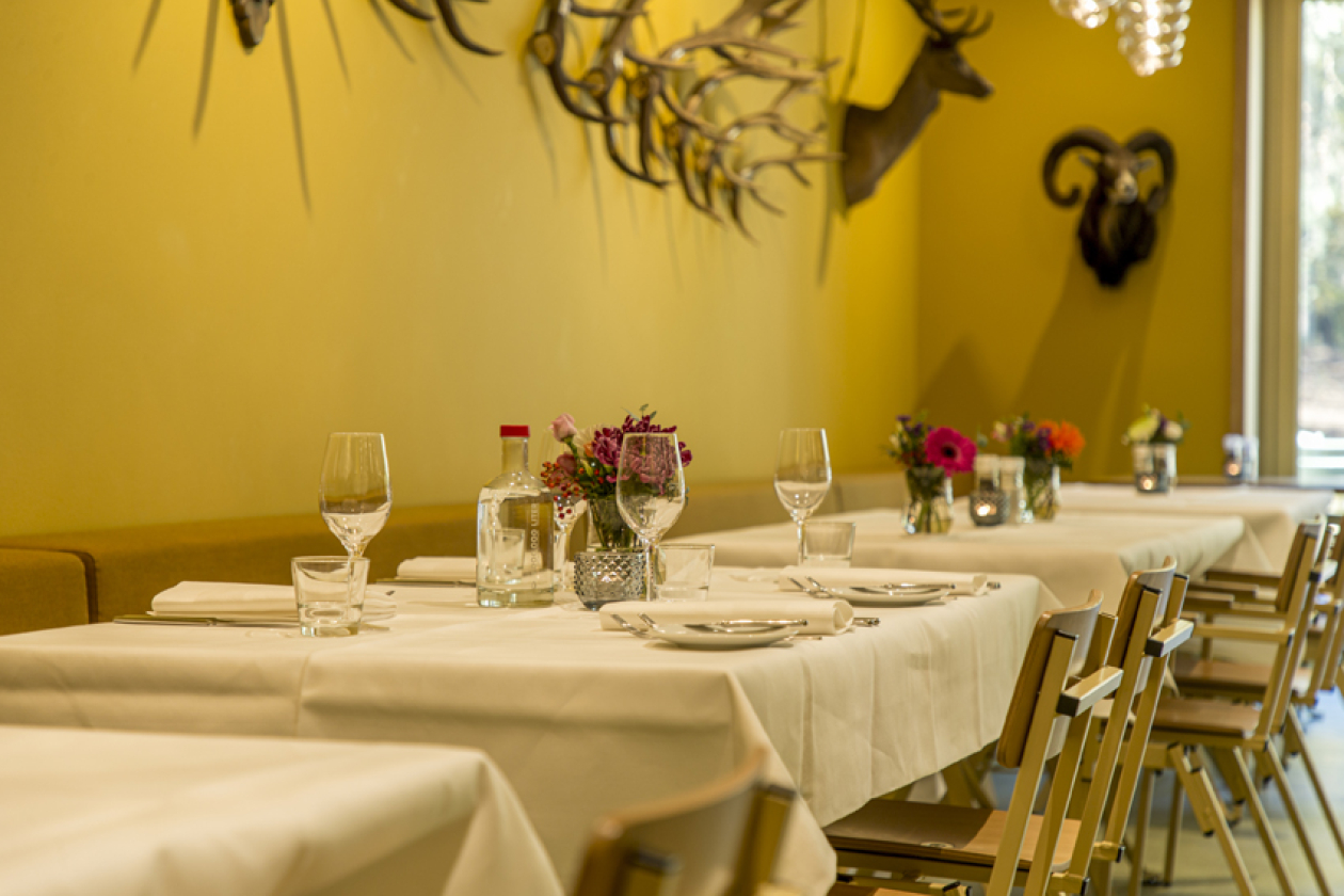 Het Nationale Park De Hoge Veluwe kiest weloverwogen. Op basis van verantwoord en duurzaam. Bas: ‘wild bijvoorbeeld, komt uit het Park. Als de wildstand op peil is, staat er geen wild op het menu. We gebruiken graag producten uit eigen moestuin, dus dat bepaalt mede hoe de kaart eruitziet. Bij het verwarmen en koelen van het gebouw wordt gebruikt gemaakt van een WKO-installatie (warmte- en koude-opslag). Hierbij wordt in de zomer koud water uit de bodem gebruikt om het gebouw te koelen en in de winter warm water om het gebouw te verwarmen. Bovendien heeft het dak een groot aantal zonnepanelen die het pand voorzien van stroom. En je kunt bij ons gratis je auto opladen. Zodat niet alleen de persoon opgeladen het Park verlaat, maar ook de auto.’